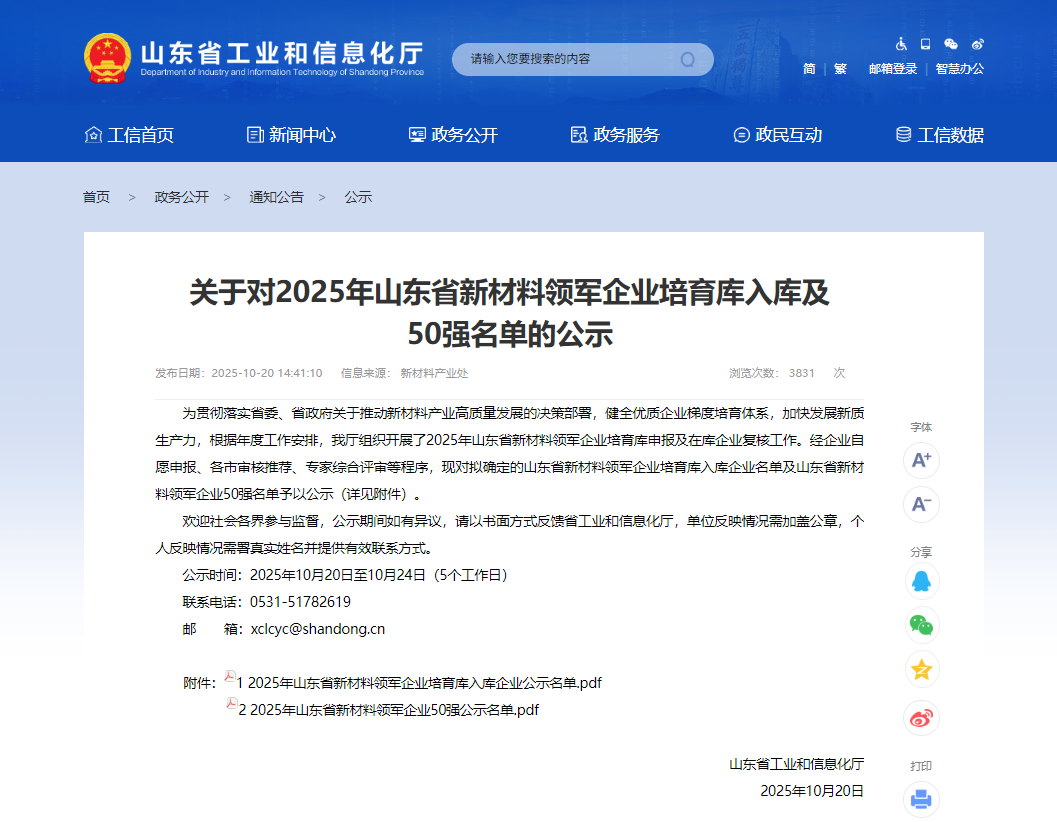 10月20日,山東省工業(yè)和信息化廳發(fā)布了《關(guān)于對(duì)2025年山東省新材料領(lǐng)軍企業(yè)培育庫(kù)入庫(kù)及50強(qiáng)名單的公示》。